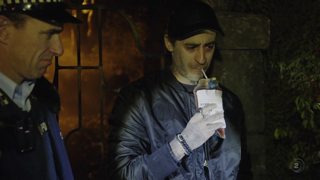 That night, the two officers head to Wellington Central Hospital to investigate the disappearance of 19 blood bags. Minogue finds one in the car park, but accidentally bursts it while trying to fit the contents into a smaller evidence bag. The officers then interview the hospital’s new blood bank officer, Nick, who struggles to hide his vampiric appearance. He hypnotises them into not taking him to the station and they leave without him.