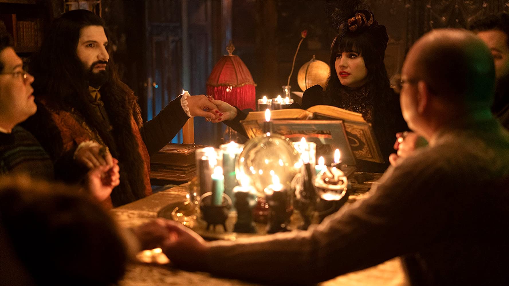 Laszlo and Nandor were kidnapped by a coven of witches. Guillermo drove after them with Nadja and Colin to their hideout, an aromatherapy store in Brooklyn. The three were captured and locked in a strange room covered in doors until Guillermo found the exit. They progressed into a room where the witches were about to extract Laszlo and Nandor’s semen through the use of eighteenth century surgical tools. Upon seeing Colin, who took credit for the escape, they shackled him for use as well. Guillermo saved the vampires by offering to sell the witches a regular supply of Laszlo and Nandor’s semen so the coven would not run out or harm the vampires. The witches agreed to this, but turned down Guillermo’s offer to also sell them Colin’s.[25]