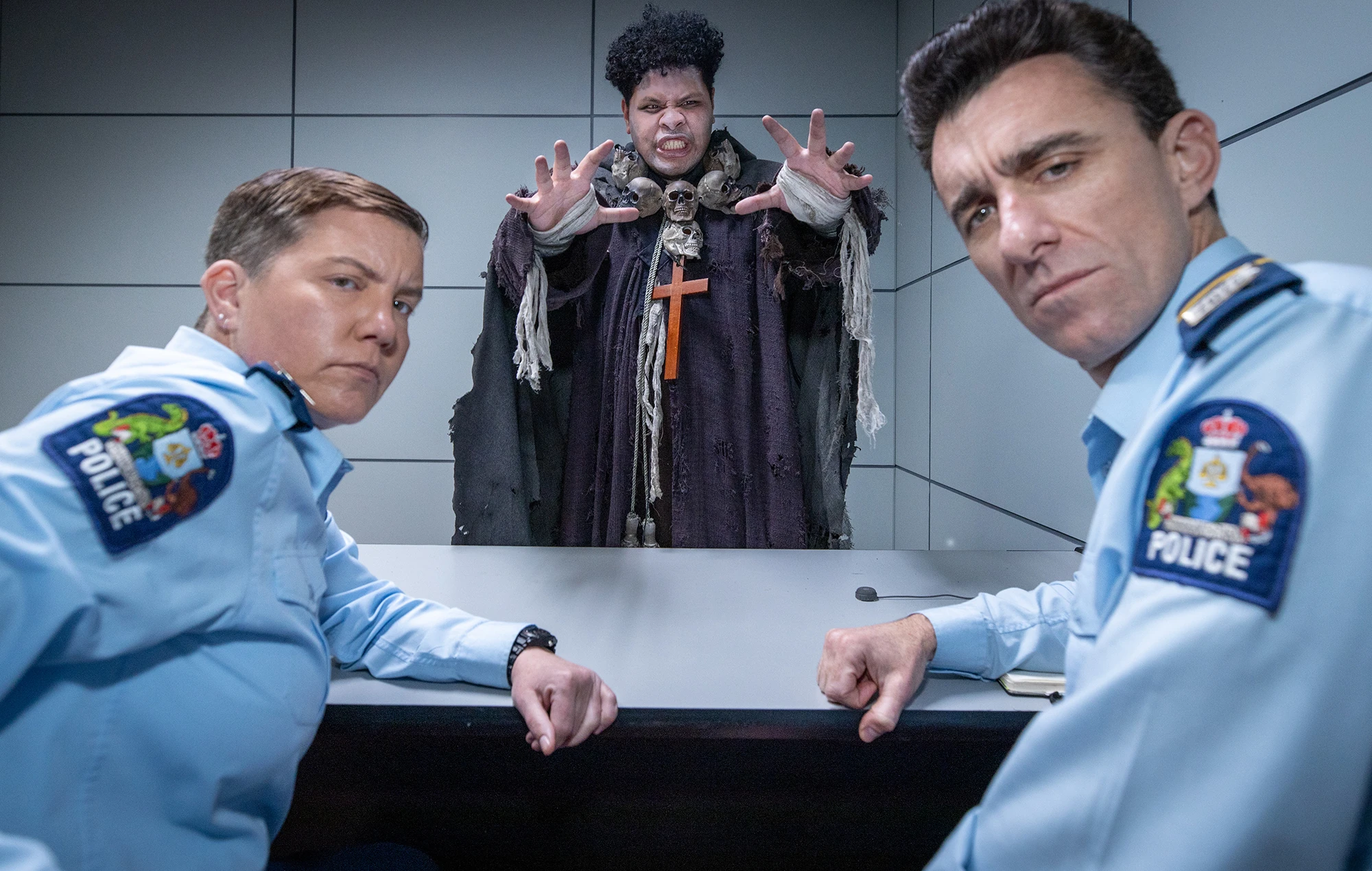 Minogue and O’Leary were sent to investigate ghost sightings in the Lower Hutt region, but all they found was a plastic bag floating in the wind. The bag turned out to be a yōkai, which later tried to attack Maaka at the station. That night, the officers went to Wellington Central Hospital following a report of nineteen blood bags going missing. The blood bank officer, Nick, successfully hypnotised the two cops into not arresting him. Maaka correctly guessed that Nick was a vampire and sent the officers to interrogate him again. On the way to the hospital, they found Nick and several hooded figures taking part in a satanic ritual while circling a tied naked man. Nick claimed they were only roleplaying and hypnotised the man into claiming he was completely fine. Minogue and O’Leary then encountered multiple clowns jaywalking, dancing in the road getting in and out of a small car, but the clowns drove away when the officers were speaking to the camera. They then went into a cemetery to investigate sightings of “ghosts”, which turned out to be goths, but they successfully caught Nick disguised as a delivery man. Nick was forced to admit that he stole the blood bags for a party and was arrested. In the police car, Nick slipped out of the handcuffs and used the distraction to hypnotise O’Leary and Minogue into letting him go free and forgetting about everything that happened.[9]